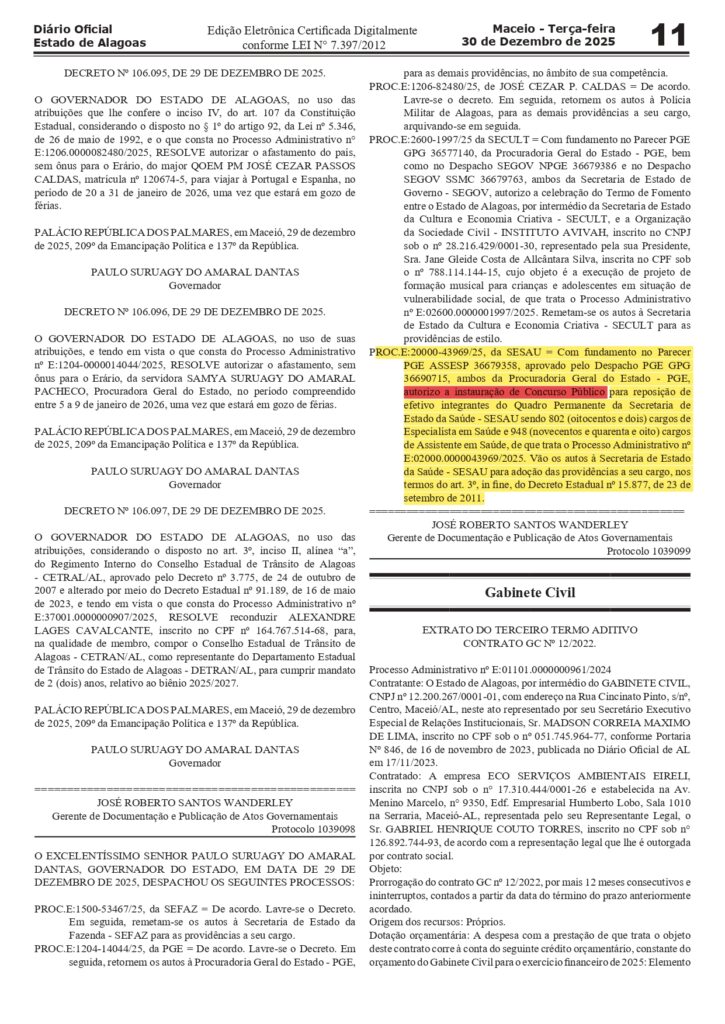 O Governador do Estado de Alagoas, Paulo Dantas, autorizou a instauração de Concurso Público para reposição de efetivo do quadro permanente da Secretaria de Estado da Saúde (SESAU), conforme o Processo Administrativo nº E:02000.0000043969/2025.