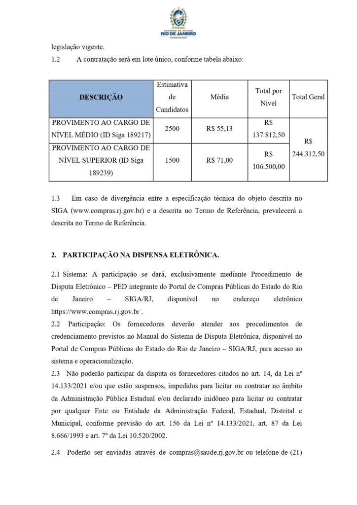 O concurso da Secretaria de Estado de Saúde do Rio de Janeiro deu um passo decisivo e agora entrou de vez na fase de organização. Foi publicada a Dispensa Eletrônica para contratação da banca responsável pelo certame, confirmando a oferta de 287 vagas para a SES/RJ e para o IASERJ . A sessão está marcada para 02/03/2026, quando acontecerá a fase de lances.