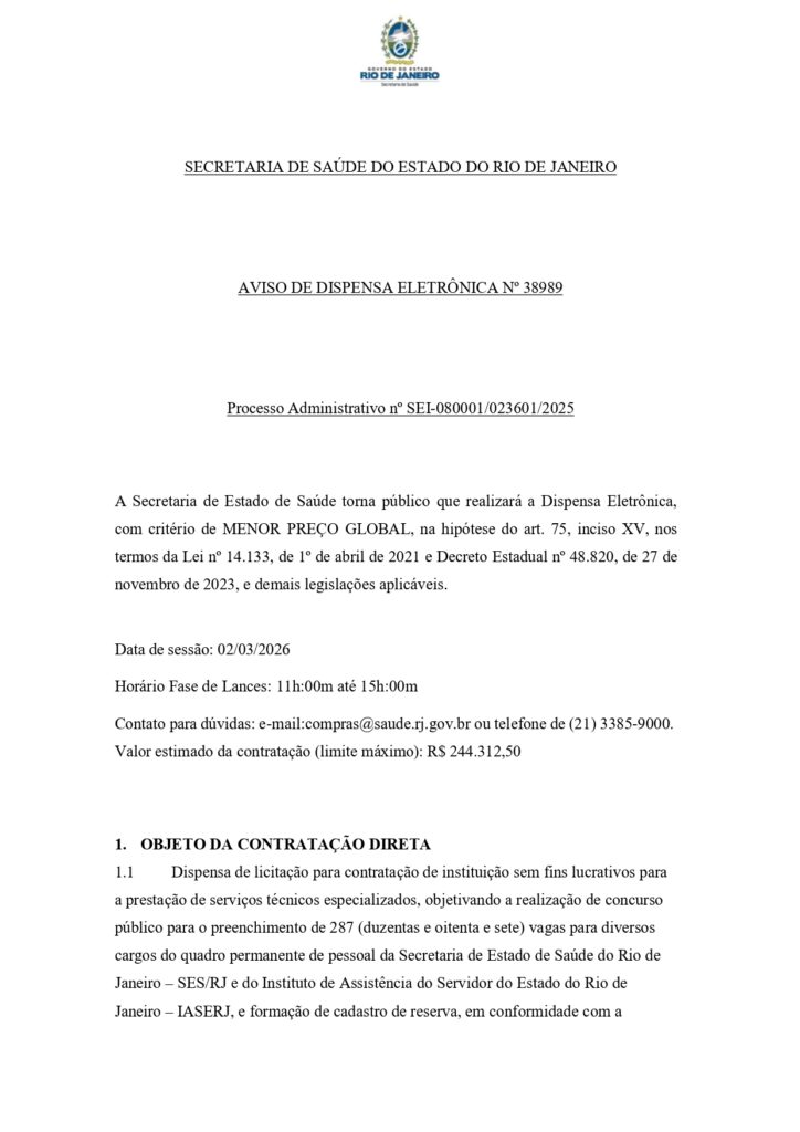 O concurso da Secretaria de Estado de Saúde do Rio de Janeiro deu um passo decisivo e agora entrou de vez na fase de organização. Foi publicada a Dispensa Eletrônica para contratação da banca responsável pelo certame, confirmando a oferta de 287 vagas para a SES/RJ e para o IASERJ . A sessão está marcada para 02/03/2026, quando acontecerá a fase de lances.